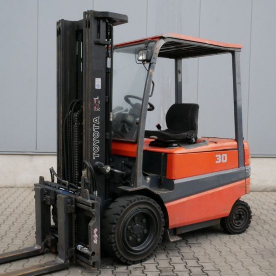 Електрокар Toyota FBMF30 Предлагаме втора употреба 4-опорен електрокар Toyota, модел FBMF30. Електрокарът е с товароподемност 3000 кг, работна височина 5000 мм, триплекс мачта. Машината е произведена през 1997 година, само на 7000 работни часа, в отлично техническо състояние. Електрокарът е оборудван с 3-та и 4-та хидравлични линии, виличен изравнител и позиционер Kaup. Батерия 80V от 2013 година. Вилици – къси 1000 мм. Техническите параметри са посочени в допълнителни данни.
