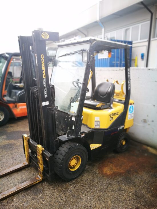 Газов мотокар Daewoo G20SC 2000kg Предлагаме втора употреба газов мотокар Daewoo, модел G20SC. Мотокарът е произведен през 2004 година, в отлично функционално състояние. Товароподемност 2000 кг, работна височина 3300 мм и дуплекс мачта. Гуми – пневматични в добро състояние, виличен изравнител. Техническите характеристики са посочени в допълнителни данни.