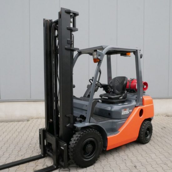 Газов мотокар Toyota 8FGF25 2500 kg Предлагаме втора употреба газов мотокар Газов мотокар Toyota 8FGF25 2500 kg. Газовият мотокар е в отлично техническо състояние. Произведен през 2014 година, на 6061 моточаса. Товароподемност 2500 кг, височина на повдигане 4000 мм, стандартна мачта. Газокарът е оборудван с вграден виличен изравнител, супереластични гуми. Височина на машината с прибрана мачта 2480 мм. Вилици къси 1000 мм. Техническите параметри са посочени в допълнителни данни.