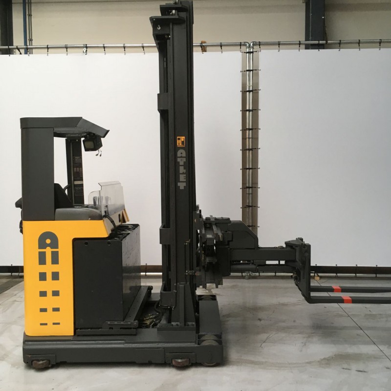 Рийчтрак за тристранна обработка Atlet 125DTFXG670URF Предлагаме втора употреба рийчтрак Atlet, модел 125DTFXG670URF. Складовата машина е предназначена за много тесни работни коридори, с мачта за тристранна обработка на палетизирани товари. Товароподемност 1250 кг, височина на повдигане 6700 мм, триплекс мачта. Складовата машина е с батерия от 2012 година 775 Ah, зарядно устройство втора употреба. Произведена през 1998 година, в отлично функционално състояние, на 5400 моточаса. Рийчтракът е снабден и със транични колела за движение по релси. Техническите параметри са посочени в допълнителни данни.