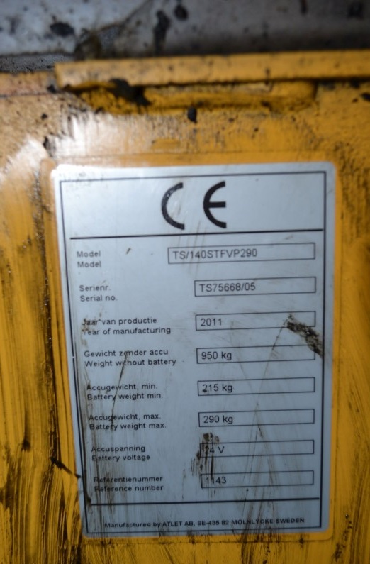 Стакер Atlet TS140STFVP290 1400 kg Предлагаме втора употреба електрически стакер Atlet, модел TS140STFVP290. Стакерът е произведен през 2010 година, само на 500 работни часа, в много добро функционално състояние. Товароподемност 1400 кг, работна височина 2900 мм, с дуплекс мачта. Батерия 24 V/240 Ah от ноември 2011 година. Височина на машината със спусната мачта 2000 мм, вилици 1150 х 560 мм. Стакерът е с платформа за водача. Техническите параметри са посочени в допълнителни данни.